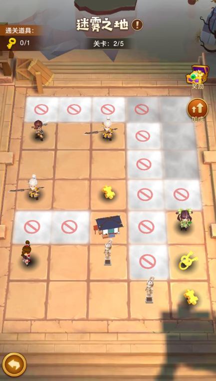 通关规则:迷雾境地共设为5个关卡。每轮关卡共有35个格子,每个格子都会触发随机事件,通过探索翻开迷雾格子找到到通关钥匙,即可通往下一关卡。最后有一个关卡为BOSS关,需打败BOSS才能成功通关。