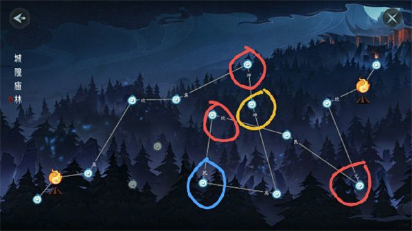 要先给萌新解释一下,这个地图,如果想要直接到达篝火是不行的,会有一个结界挡住,你需要得到三个符咒才能解开结界,红色的圈是解开结界的符咒所在地,而黄色的圈是法宝“仙酿葫芦”(这个法宝带上可以增加最大生命值)的所在地,蓝色的呢,就是额外剑魄获得地,这个路线就是不错过任何奇遇的最佳路线图
