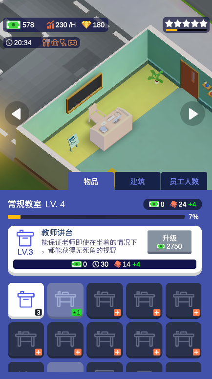 4、越后开的教室学习越快,前期适当升级回钱较快的设施(教学楼的厕所收益也不差的,我到教室都开完了才发现还能升级厕所)。