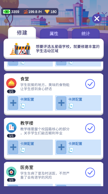 1、前期开教室开床位来增加收益,教室椅子看情况开两排就足够用了,食堂座位同理。