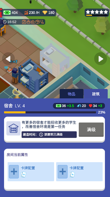 让我印象深刻的是游戏里的各种奇葩设定,比如学生会因为宿舍灯不好而退学,这种桥段真是既搞笑又无奈。虽然游戏里有离线收益但最多只能挂两小时,这点我得记牢,不然白玩了。还有就是尽量早开教室和床位,升级一些基础设施能更快回本。