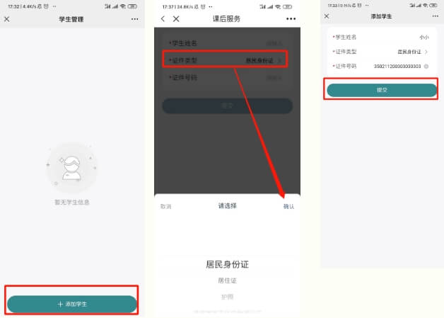 2.2 点击【添加学生】,跳转学生信息填写页面,填写学生信息,选择【证件类型】后,点击提交,若提示添加成功,可进行报名。(若已有学生信息,可忽略此步骤)