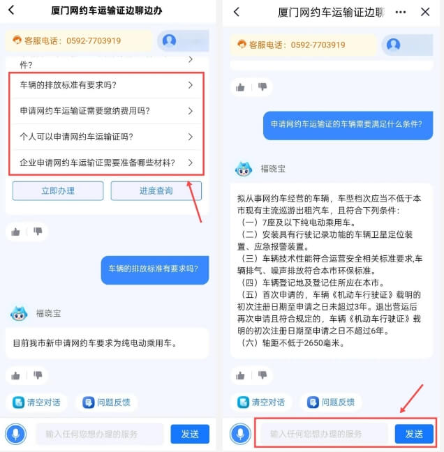 2.点击推荐问题,福晓宝将为您提供专业解答,或者是在输入框输入您想了解的网约车运输证问题即可获得相关解答,例如输入“申请网约车运输证的车辆需要满足什么条件?”后,福晓宝将为您提供办理条件。