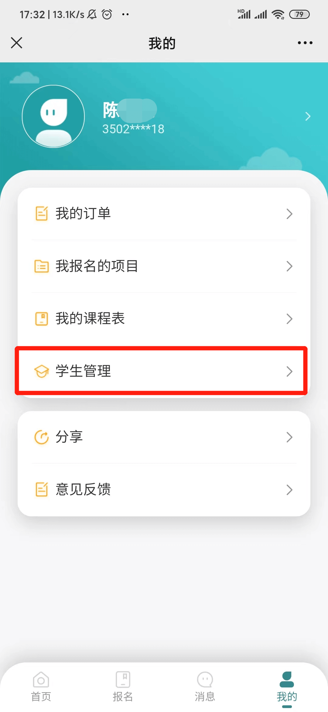 2.1 进入“课后服务”专题页面,点击右下角【我的】-【学生管理】,进入学生管理页面。