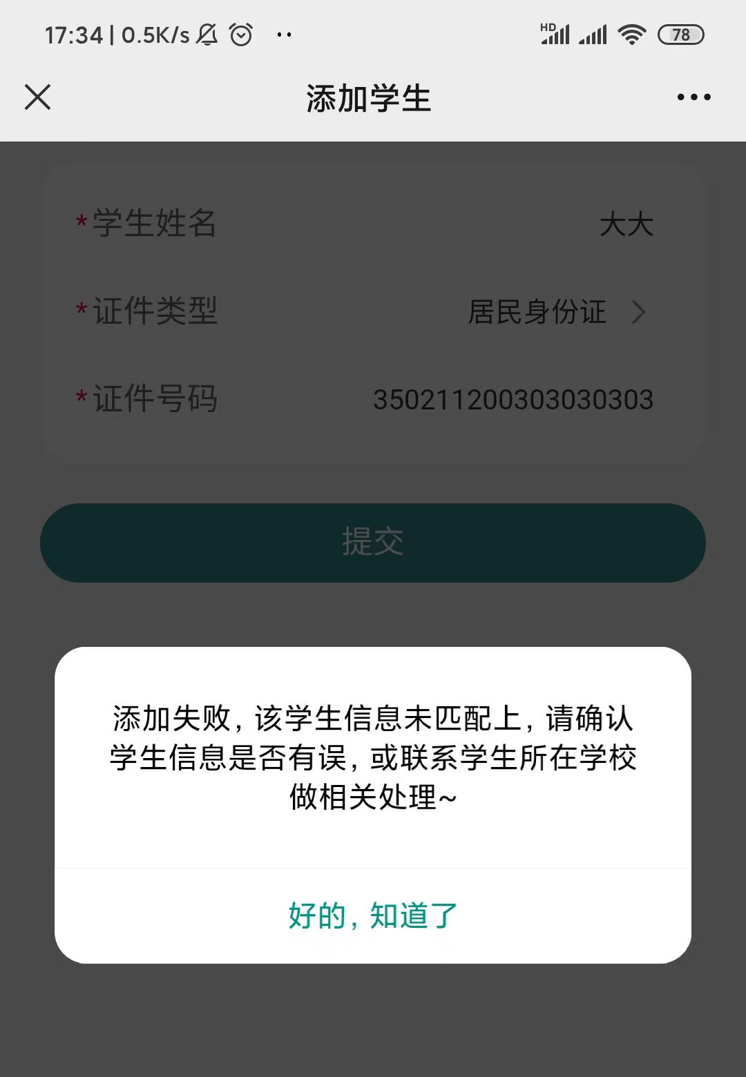 特殊情况1:如果提示添加失败,请确认填写学生信息是否有误,或联系学生所在学校处理。