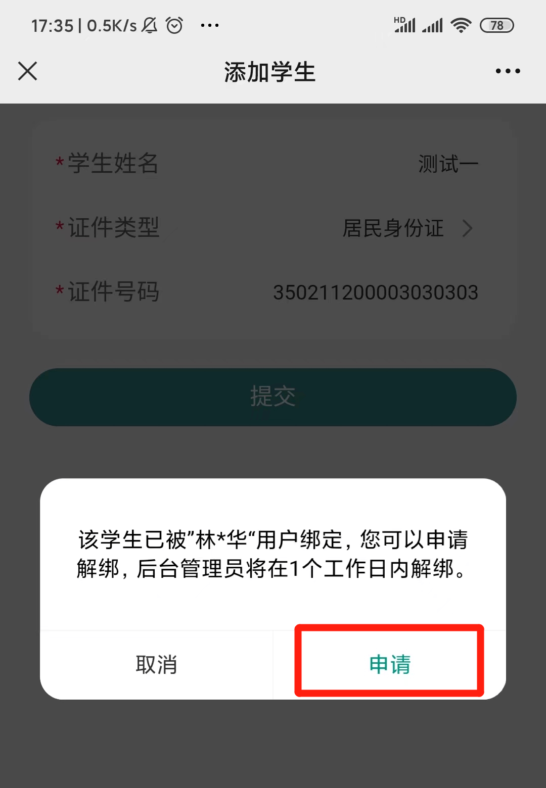 特殊情况2:如果提示该学生已被绑定,点击【申请】申请解绑,后台管理员将在1个工作日内解绑,请耐心等待。