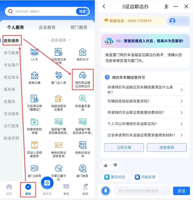 1.登录i厦门APP后进入服务页,点击【政务服务】-【网约车运输证边聊边办】即可。