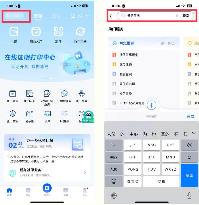 登录“i厦门”APP,顶部搜索栏搜索关键词“课后服务”,进入课后服务专题页面。