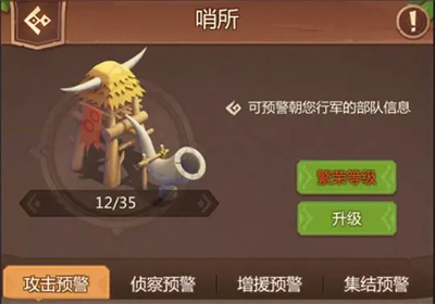 不想被打得措手不及?赶紧升级哨所。当你的领地受到攻击、侦查、运输或增援时,哨所会有情报警示你。越高级的哨所探索次数越多。