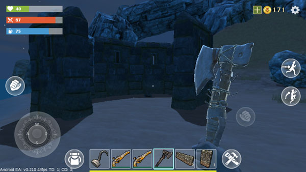 2、在首页中会有很多虚拟按键,拳头形状的攻击,圆形的是移动按钮,其他两个分别是背包和道具制作。