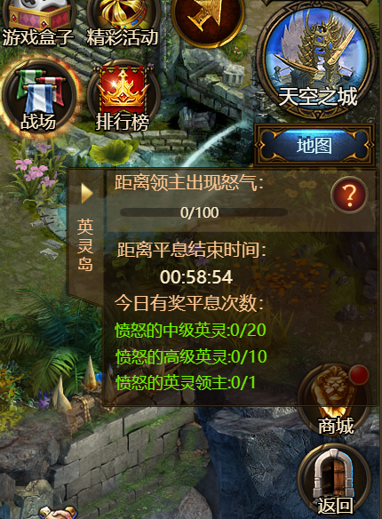 3、领主们净化中级/高级的英灵会得到一定的怒气值,怒气值为全服公用,当怒气值满100点时将出现英灵领主,英灵被击杀后怒气槽将清零,英灵领主可以重复进行刷新。