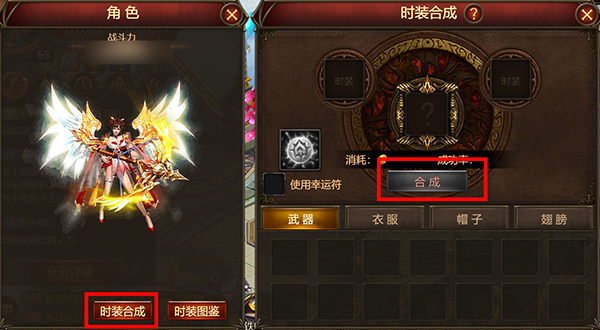 A:点击右侧【时装】图标--点击【时装图鉴】--点击【时装合成】--选择时装并放入--点击【合成】,即可完成合成。