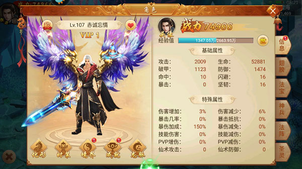 5、点开角色面板,你可以在这里查看角色的属性信息,同时角色的化形、境界提升、时装穿戴都可以在这里完成。
