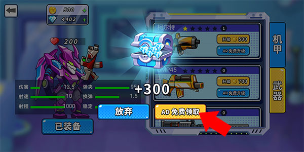 4、之后点击武器库中按照同样的方法即可获取钻石以及金币,来解锁和升级武器
