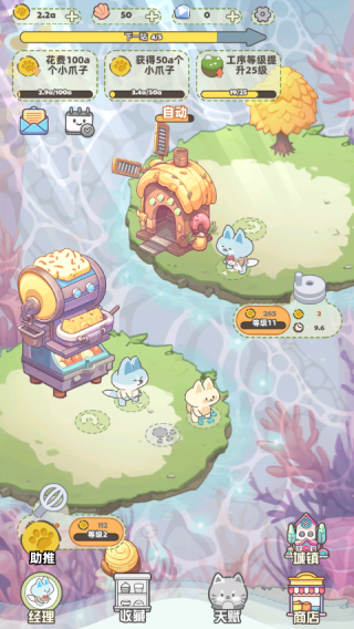 猫咪工坊是一款治愈类的模拟养成手游,画面精美,玩法有趣,玩家将携手猫咪们一同打造出一条又一条美食生产线,从磨坊开始,逐步扩大到搅拌厂、烘焙屋、奶油机、裱花店、游船码头、奶茶工坊等等,并雇佣招募各种各样的猫咪经理,完成自动化生产,源源不断的为市场输送美食和魔力橡果。