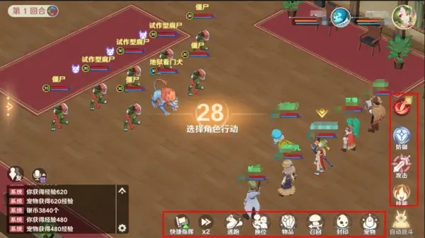 竖排菜单:上方第一个(显示的当前使用技能),防御(主角或宠物选择下次战斗为防御),攻击(主角或宠物选择下次战斗为普通攻击),技能(切换下次使用的技能)