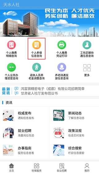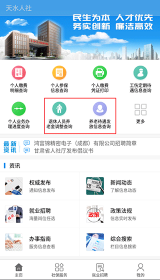 天水人社app是天水市人力资源和社会保障局为广大市民打造的“互联网+人社”惠民服务平台,主要提供个人权益查询、个人申报业务查询、公共信息查询等多项功能,是“电子社保卡”在人社系统的全应用示范项目。天水人社平台平台围绕市民关注的人社领域热点问题,及时发布政策法规、办事指南等权威资讯,让广大天水市民随时随地享受“智慧人社”贴心服务!另外天水人社还为用户提供了社保缴费查询,个人信息查询,工伤待遇信息查询,以及退休人员养老待遇信息查询等功能,即时发布人社新闻资讯,政策法规等相关人社动态信息,让用户做到足不出户了解人社最新政策。