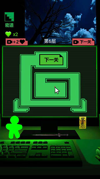 游戏的画面很暗黑,绿色色调加上随时可能出现的恐怖形象,让人一直紧绷神经。特别是迷宫里还会弹出鬼脸,胆小的玩家估计会被吓得不轻。游戏里有很多地图,难度逐渐增加,需要仔细解谜才能通关。玩的时候要注意只能在绿色区域移动,碰到黑色部分就会扣生命值,还挺考验手速和反应力的。