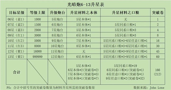 光暗炮和神魔炮6-13星升星所需材料表
