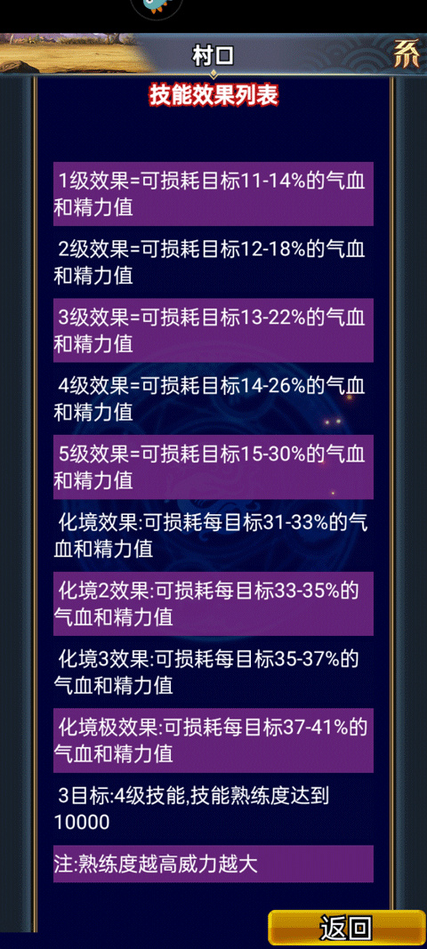 汉风幻想三国OL手游中每个技能共分5级,每级的熟练度上限为6000,熟练度总上限为30000,熟练度越高技能效果越明显。当玩家达到90级并且达到熟练度上限时,则此技能达到化境阶段,技能效果达到巅峰。