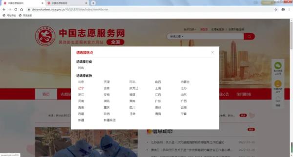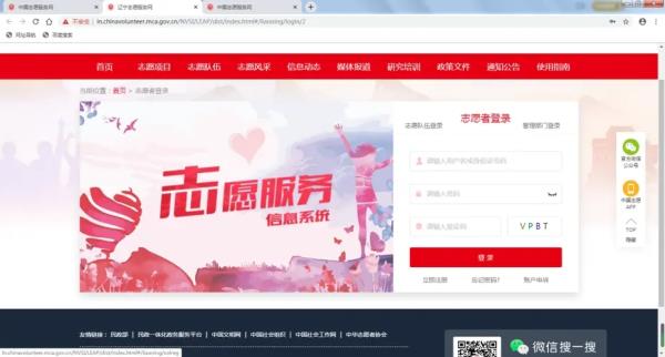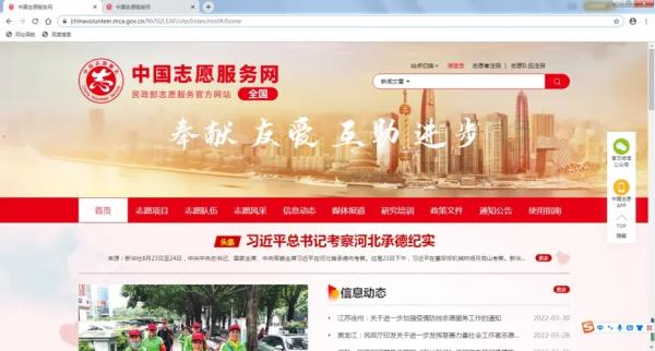 1、浏览器搜索中国志愿服务网或者输入https://chinavolunteer.mca.gov.cn/,进入后点击右上方志愿者注册