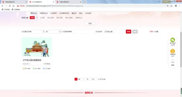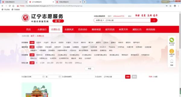 4、申请完成后,点击屏幕上方志愿队伍,在右上方搜索栏搜索“辽宁税之爱志愿服务团”,并点击进入