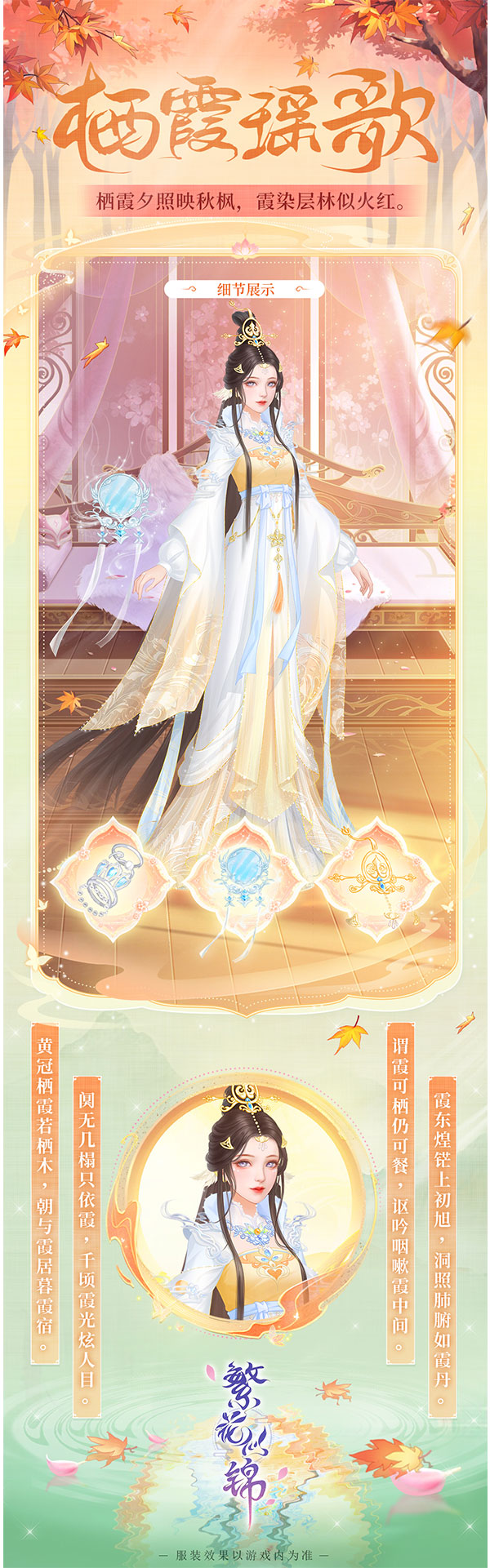 残阳似血,晚霞如枫,不知仙主大人们是否留意到,高手秘籍内的“顶尖高手”专属套装——栖霞瑶歌呢:明镜高悬,映射出如霞般柔美的云袖和裙摆,并且该套装还可额外获得通天塔的通关实力加成,修仙升阶快人一步~