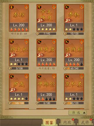 武将升星:消耗同名武将碎片(6星之后需要醒邃石+武将碎片)可升星武将,最高为10星武将装备:武将装备分蓝,紫,橙,专属装备4大类别。目前仅开放了橙色装备升星,暂未开放其他装备的深度养成线