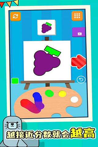 1、匹配所给的形状和颜色,越接近分数就会越高,可以和自己的小伙伴一起比拼,看看谁的绘画能力更强。