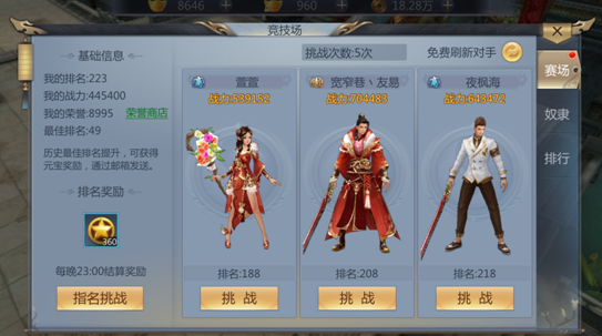竞技场是一个给玩家提供自由竞技的场所,玩家可挑选势均力敌的对手进行挑战,挑战成功不仅可提升排名,还可获得荣誉奖励用以兑换珍贵道具。
