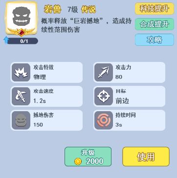 岩兽的定位是小怪杀手,他自身攻击力不算低,同时有很高几率触发范围攻击技能,通过提升科技级别能够极大增加范围攻击力。