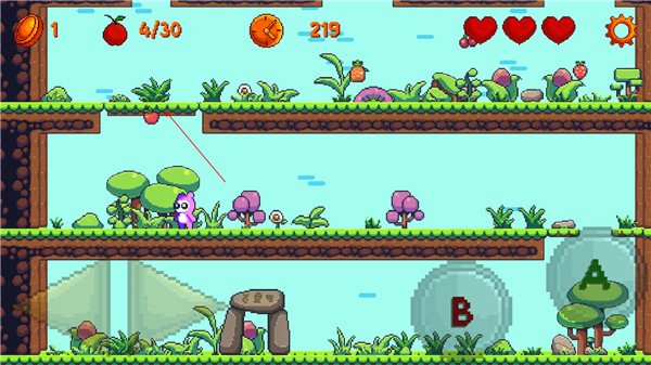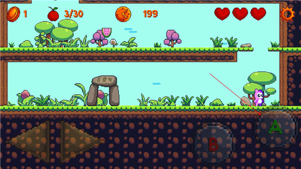 游戏的玩法很简单:用左边的方向键控制移动,右边是攻击和跳跃键,长按还能超级跳跃,跳得更高更远。路上会遇到各种陷阱和敌人,需要灵活应对。收集水果不仅能提升评价,还能让闯关更有乐趣。解锁新关卡的过程也很有意思,每次完成一关都会有新的惊喜。