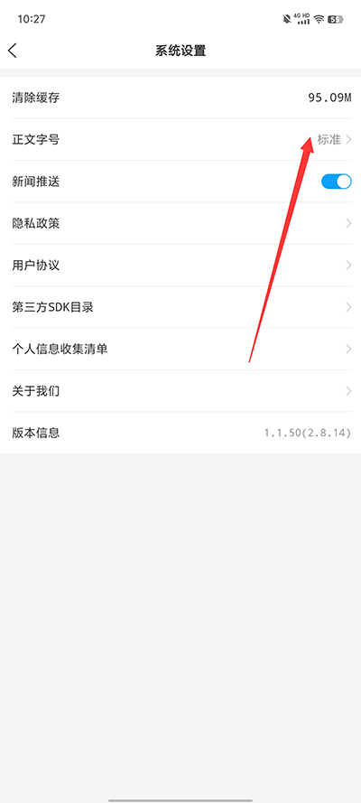 3、接着在【设置】界面内点击【正文字号】;