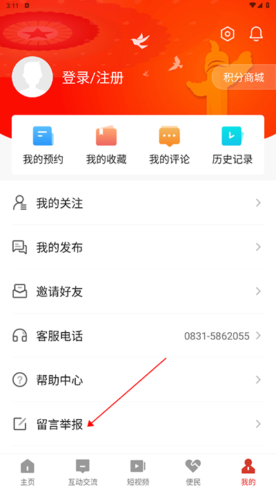 2、在个人中心界面内找到并点击“留言举报”;
