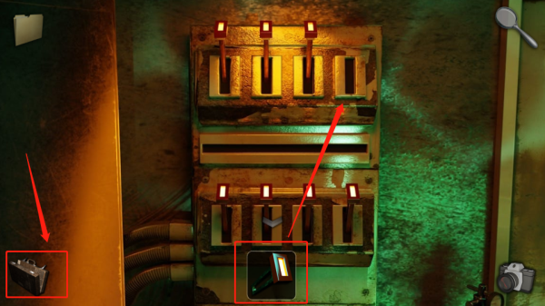 6、点击右侧柜子,点击潜水镜下纸条,根据纸条拉下控制杆