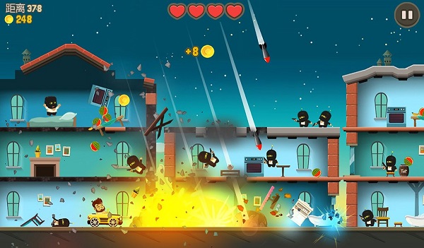 游戏让大家体验到了只需一手操控也能感受猛烈撞击的快感,刚开始贴心的新手教程也足矣让玩家一目了然,只需上下滑动屏幕,便可操控这位大胡子上下跳跃来回穿梭撞击在各个楼层之间,并在躲避敌人的攻击同时攻击敌方解救人类。