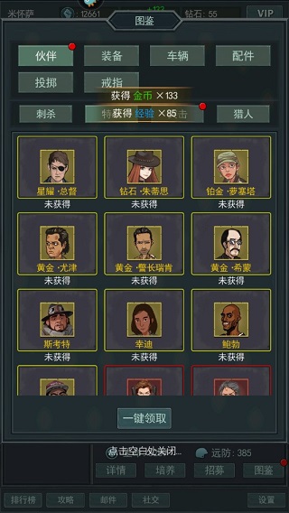 4、点击图鉴可查看伙伴、装备、车辆、配件、投掷、戒指,还能查看不同属性的伙伴,如已获得那么点击一键领取即可