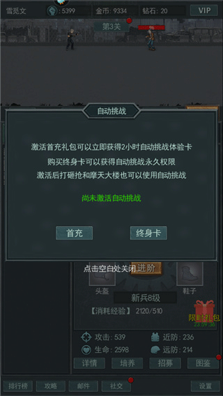 3、点击自动挑战即可自动战斗,激活首充礼包可以立即获得2小时自动挑战体验卡,购买终身卡可以获得自动挑战永久权限,激活后打砸抢和摩天大楼也可以使用自动挑战
