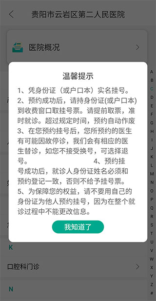 3、详细阅读挂号前的温馨提示,阅读完成后,点击下方的【我知道了】按钮。