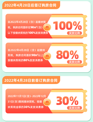 第一类购房人,购房合同在90平方米(含)以下的按所缴纳契税的100%发放消费券;购房合同面积在90平方米以上的,按所缴纳契税的80%发放消费券。