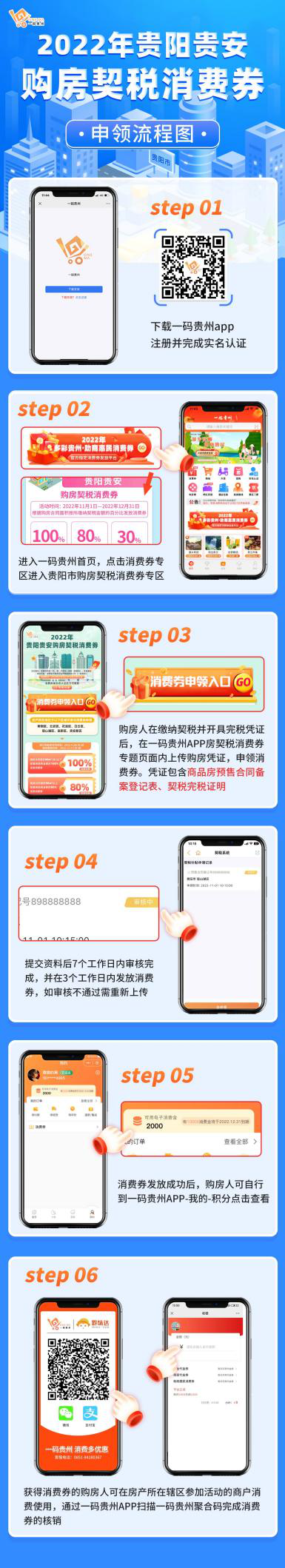 步骤一:下载一码贵州APP注册且完成实名认证——购房人缴纳契税,并开具完税凭证——在“一码贵州”房契税消费券活动页面上传凭证(商品房预售合同备案登记表、契税完税证明)——点击申领消费券;