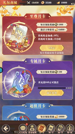一般这游戏三卡党较多,三卡是终身卡,成长周卡和月卡,周卡和月卡主要是元宝和材料才的获得很适合最开始的阶段,终身卡可获得一只前期高输出的红色武将,有助于提高阵容战力,但是主要的还是终身卡所增加的挂机经验增加10%,对于等级等方面提高了很大的优势
