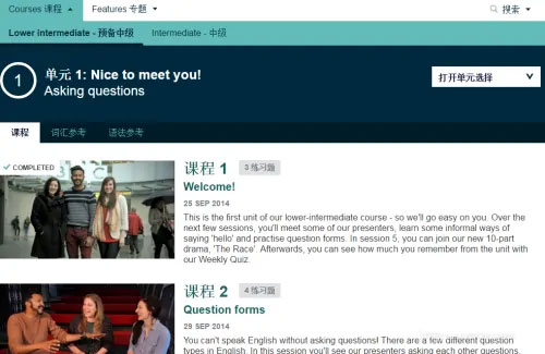 课程按照难度水平分类,各个课程都包括语法和词汇的内容,课程中间设置了活动,课后还有练习题。至于高级别课程的部分还特意增添了改善语音的单元,介绍各种发音技巧,非常有启发性。