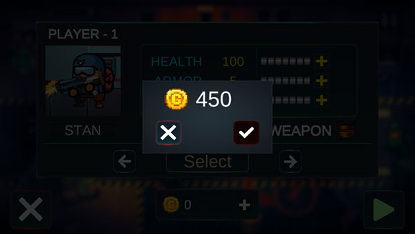 游戏的一大亮点是支持双人联机模式,可以在一台设备上与朋友一起玩耍,增加了互动乐趣。操作简单,单人模式选择角色和武器后即可开始射击,通过移动和瞄准来消灭所有敌人完成闯关。随着关卡的推进,还能用金币升级武器和角色,提升战斗能力。