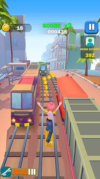 地铁3D冲刺是一款休闲跑酷类游戏,游戏中你将扮演一位倔强的女孩,在地铁铁轨上躲避坏人的追捕,在奔跑的过程中,玩家会在沿途拾取金币、钥匙、道具等物品,同时需要躲避前方列车和其他物体的障碍,还可以跳上列车顶部,使用滑板来躲避抓捕,直到玩家撞上障碍物,或者被列车撞到,被坏人抓住,游戏就会结束。并且游戏还设置了装备系统,玩家可以通过积攒金币和钥匙来解锁角色,还可以解锁各类滑板,升级滑板技能,还可配备宝物和背饰,是一款非常有趣解压的好游戏。