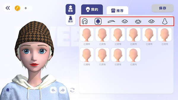 3、然后在给出的发型、脸型、眉形、眼睛等模板中做出选择;