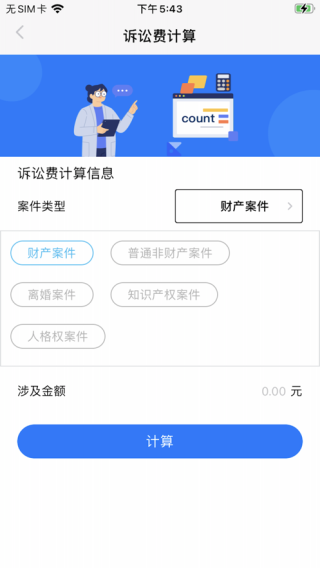 民法典app涵盖财产法律咨询、普通非财产法律咨询、离婚案件法律咨询、人格权案件法律咨询、知识产权案件的计算公式,以涉案金额快速估算诉讼费成本。