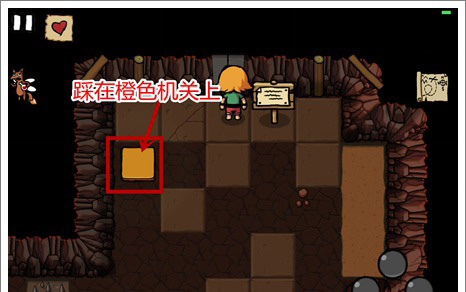 1、第一个洞穴很简单,角色踩到橙色机关上门就会自动打开了。