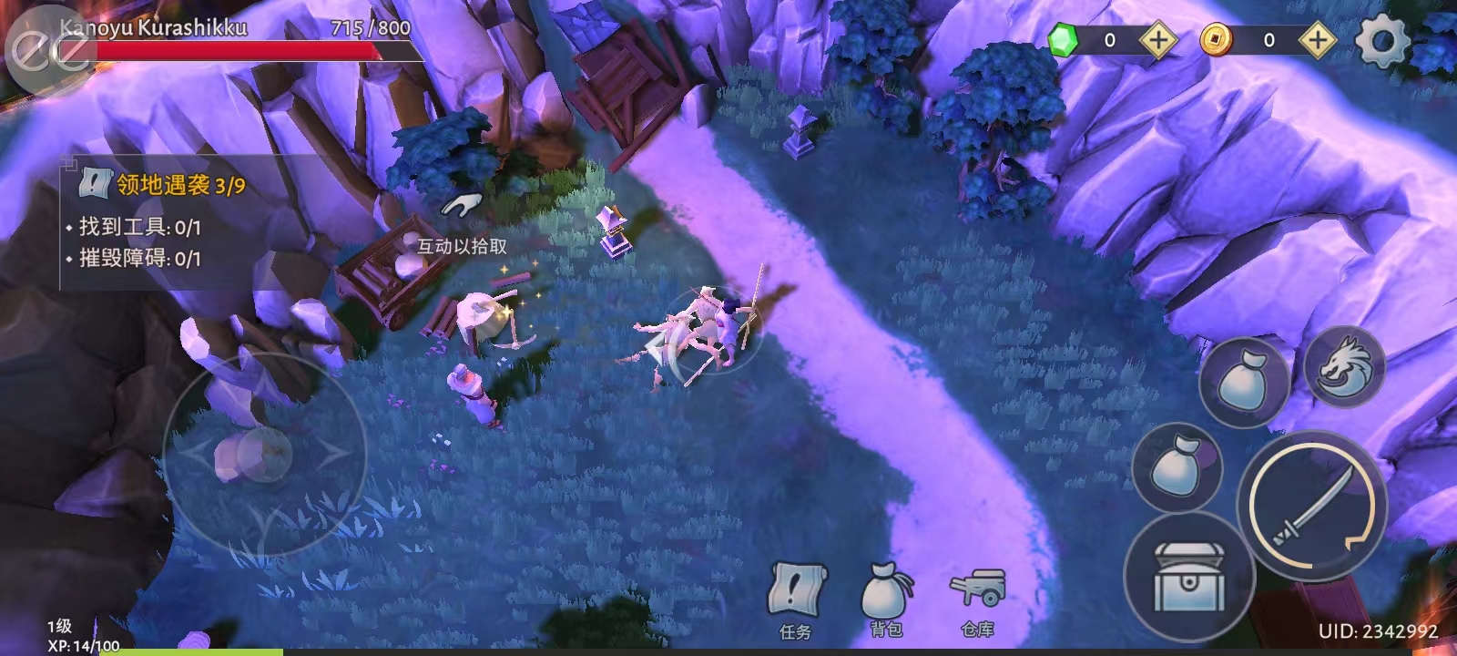 2、收到任务以后,玩家的脚底下会有一个指示箭头,可以帮助玩家更好地进行游戏,这次的任务是找到工具和摧毁障碍物,根据指示箭头,左边的按钮控制角色的移动,再配合右边的按钮使用即可;