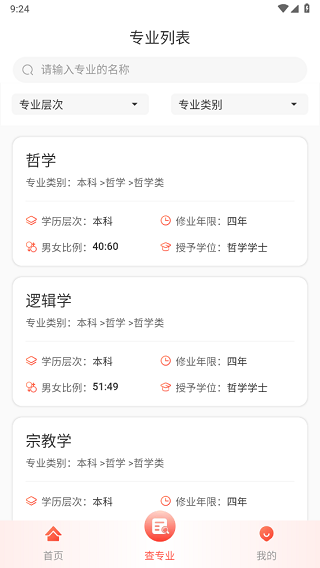 3、如果没有什么方向,可以在点击“查专业”后,往下滑,依次浏览,点击感兴趣的专业,了解相关信息